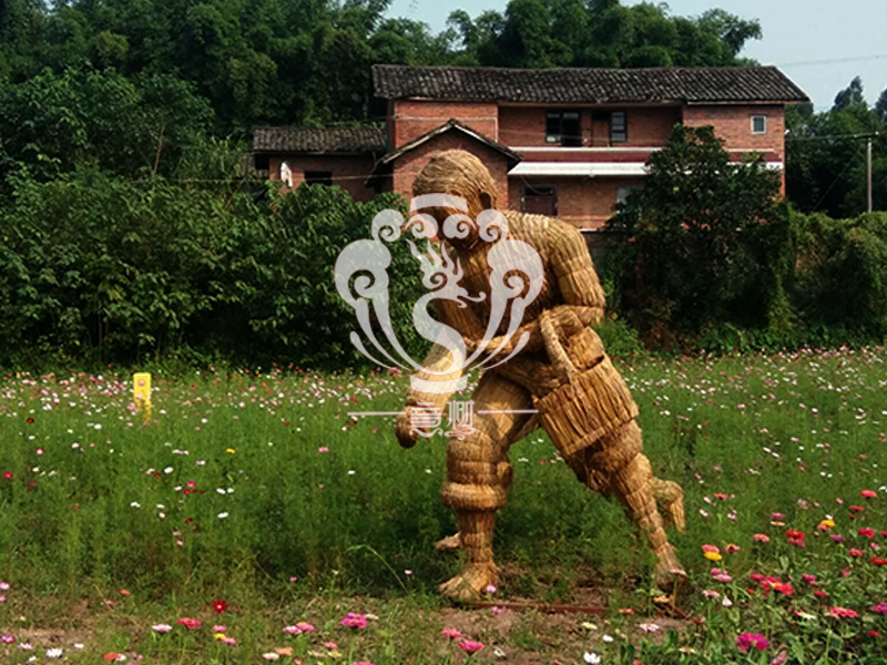 現(xiàn)在的精致稻草人藝術通常是由專業(yè)美術老師的造型放樣,然后由焊工師傅焊接出立體造型造型,然后以稻草或者稻草繩為材料編捆制作而成。