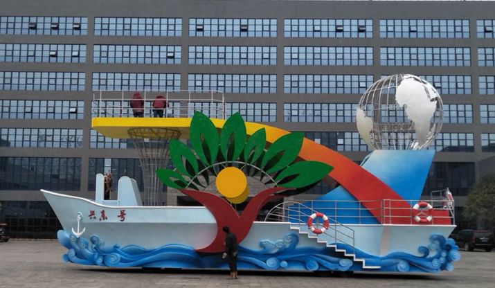 《歡樂彩虹船》長15米高7米寬6米玻璃鋼彩繪花車。此花車展現(xiàn)出一片在小船上狂歡的氛圍,與們園區(qū)的游玩設施相照應,配合ip人偶演員熱情的互動,使游客感覺猶如與我們的演員一起在這條彩虹船上盡情的歡樂。