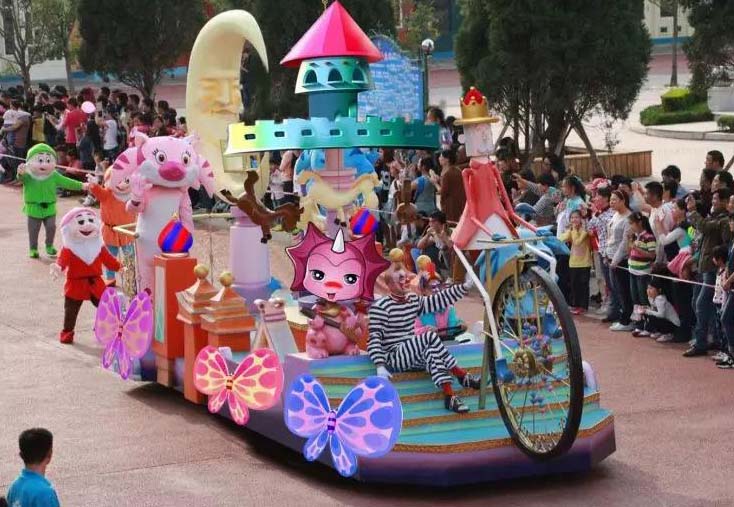 《夢游仙境》長15米高6米寬6米玻璃鋼彩繪花車。城堡是孩子們對童話世界幻想和向往,月亮城堡里呈現(xiàn)出小動物們歡樂玩耍的場景,旋轉木馬,小動物們彈琴歌唱,帶動著游客歡快喜悅的心情。