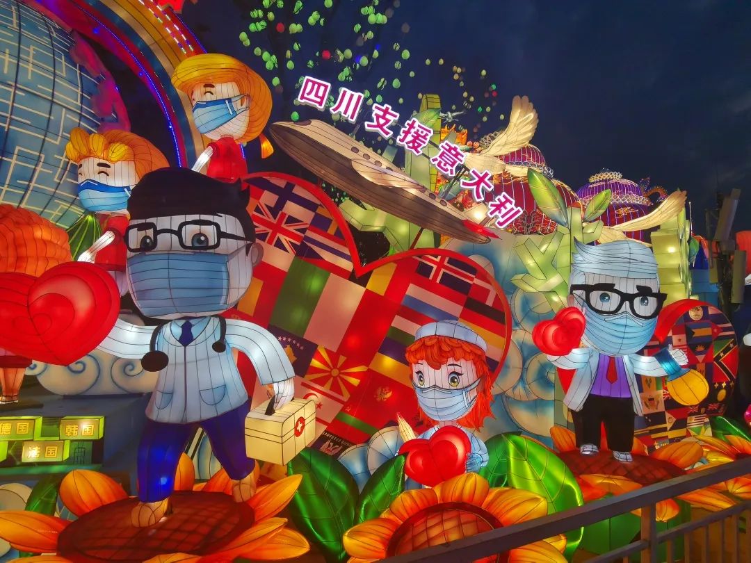 此次燈會以“春回大地、燈耀世界”為主題,是全國首個抗疫主題燈會,自貢燈會用精心創作的一組組彩燈還原了抗疫一線的“戰士們”的大無畏精神。
