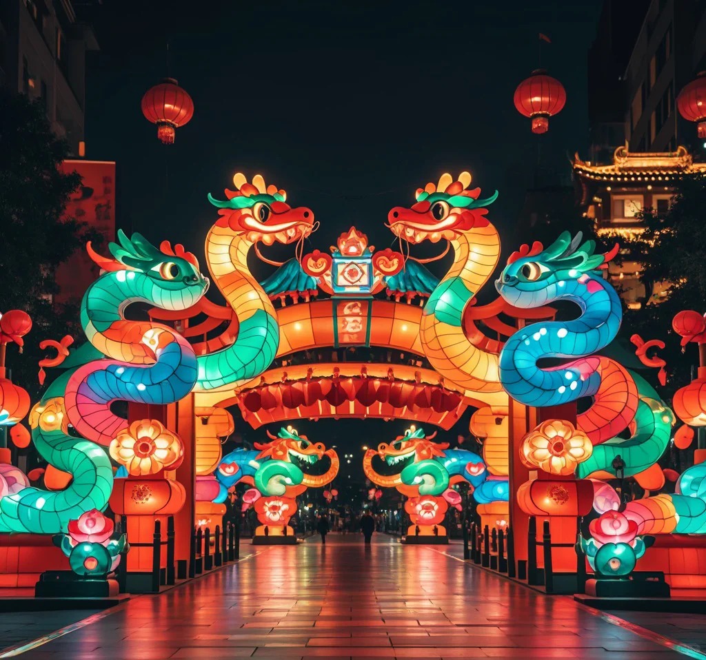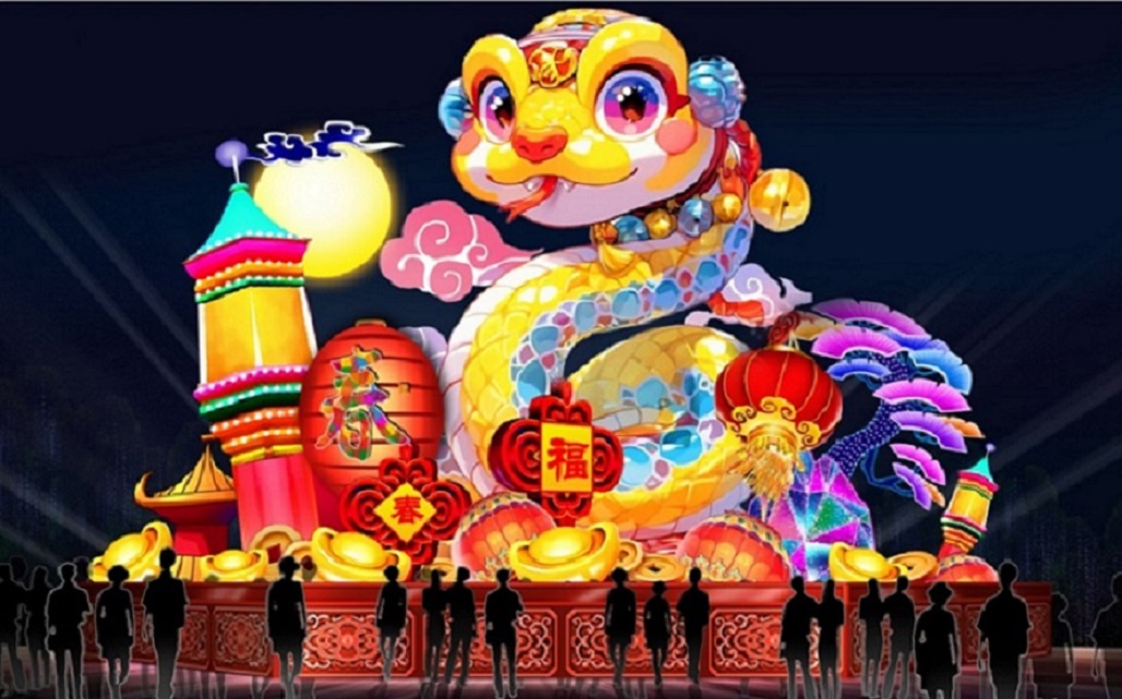 那一盞盞精心制作的新春蛇年花燈會(huì),以其獨(dú)特的造型和絢麗的色彩,瞬間抓住了人們的目光。巨大的蛇形彩燈高高聳立,它的身軀蜿蜒曲折,鱗片在燈光的映照下熠熠生輝,仿佛一條靈動(dòng)的神蛇降臨人間。蛇首高高昂起,眼神中透露出威嚴(yán)與神秘,仿佛在守護(hù)著這片歡樂的土地。