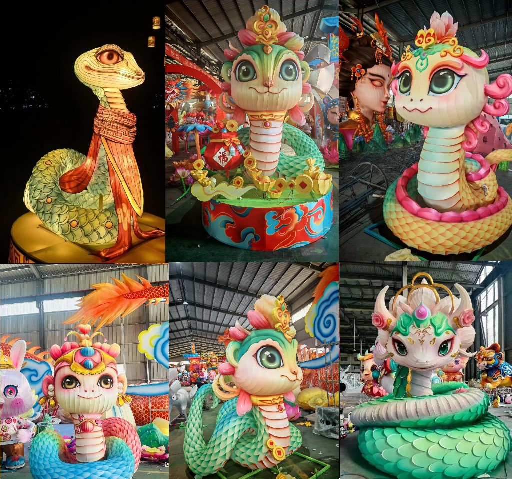 走近細(xì)看,自貢彩燈制作的工藝精湛絕倫。每一片鱗片都經(jīng)過精心雕琢,色彩斑斕,或金黃閃耀,寓意著財(cái)富與榮耀;或翠綠欲滴,象征著生機(jī)與希望。彩燈上還裝飾著各種精美的圖案,有盛開的花朵,寓意著繁榮昌盛;有飛舞的蝴蝶,代表著幸福與美好。這些圖案與蛇的形象完美融合,展現(xiàn)出了獨(dú)特的藝術(shù)魅力。