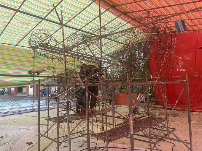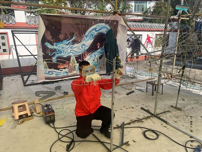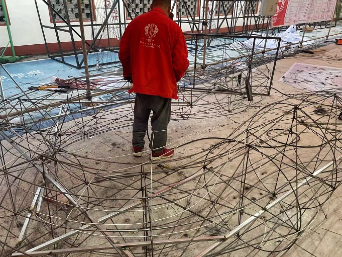 從事彩燈制作行業二十年的造型師正制作龍頭外形輪廓