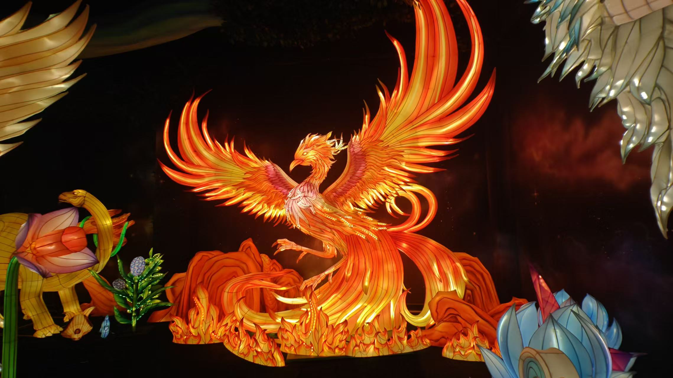 自貢彩燈素有 “天下第一燈” 美譽(yù),其工藝歷經(jīng)千年淬煉,從漢代井鹽開(kāi)采時(shí)期的雛形,到明清 “獅燈場(chǎng)市” 的興盛,如今已發(fā)展出立體絲扎、分色裱糊、瓷器捆扎等數(shù)十種核心技法。意樹(shù)文化團(tuán)隊(duì)深諳此道,在創(chuàng)作中既堅(jiān)守 “美工放樣、鉗工造型、焊工固定、裱糊上色” 的傳統(tǒng)工序,又融入 LED 節(jié)能光源、AI 互動(dòng)等現(xiàn)代科技,更創(chuàng)新性運(yùn)用特色材料,讓每盞花燈都成為技藝傳承的載體。如工匠們將以 45 度角精準(zhǔn)裁切按紋理緊密粘制成孔雀翎羽,燈光透過(guò)的天然紋路,盡顯生靈的靈動(dòng)質(zhì)感。
