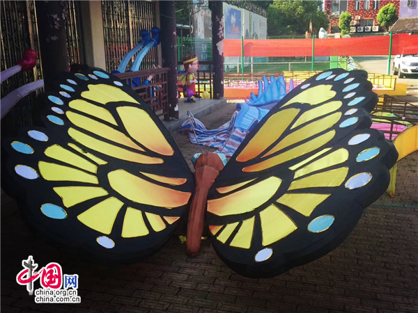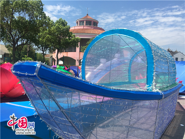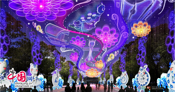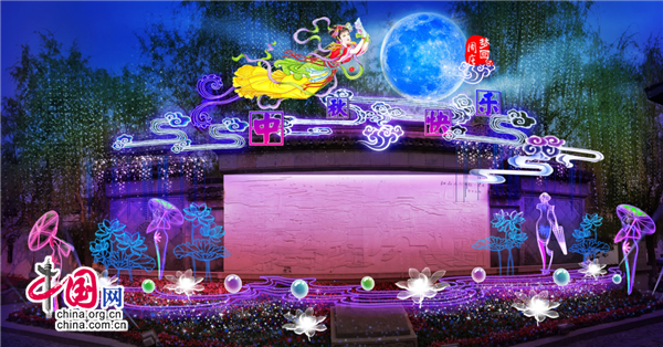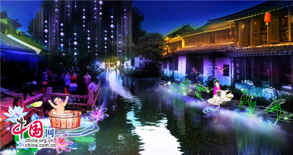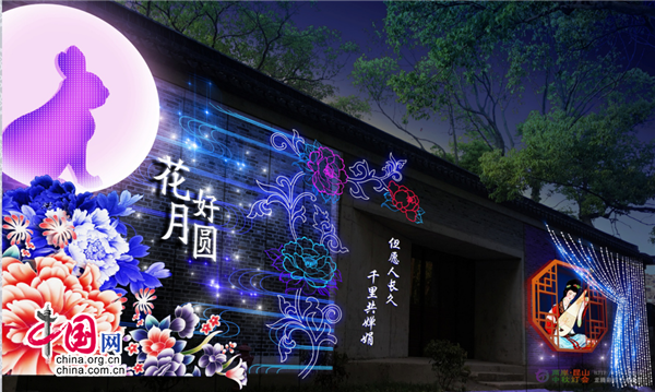 進入“周莊故事”彩燈區(qū)的第一入口,映入記者眼簾的便是富有周莊特色的“八景八俗”,通道兩側分別為八個筒子燈,上面注明景點和風俗的名稱,并配有格律詩。走過通道,移步至古鎮(zhèn)街巷,各色彩燈展現出不同造型和形式,有墻角“長”出的梅花和蓮花、有撫彈琵琶的多情女子、有彎腰浣洗的婦女,或在民居的墻面上,或在縱橫的河道里,或在古色古香的石板路。在不期而遇的每個街口和角落,伴隨“謎之誘惑”的彩燈煥發(fā)出萬種“風情”。在“祈福中華”彩燈區(qū),近10米高的大彩球上坐著兩個萌娃,憨態(tài)可掬。后面的大背景是一個16米高的巨幅扇面浮在水面,扇面上的荷花嬌艷欲滴,由扇面衍生出一輪滿月,兩側的奔月嫦娥在空中飛舞,錯落在水中的并蒂蓮花將點亮水面。